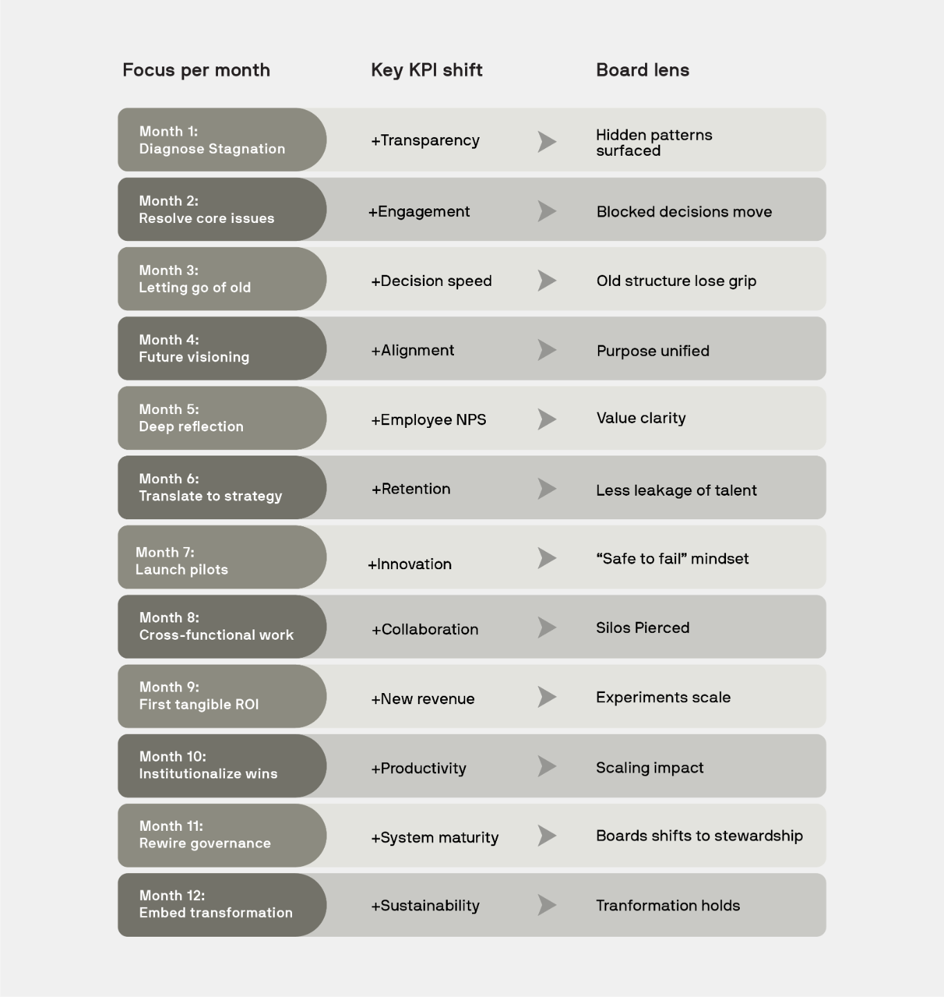 This roadmap shows how organizational systems actually change—not through announcements, but through systematic shifts in how people think, decide, and collaborate. Each phase builds the capacity you need for the next, with metrics your board can track and momentum you can feel.